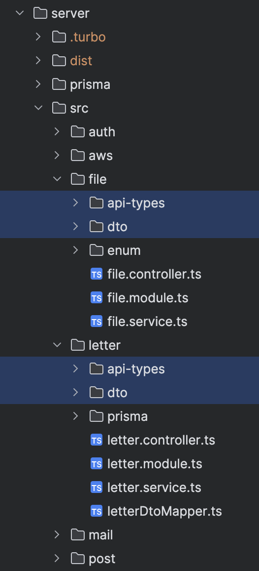 아래는 현재 nestjs의 프로젝트 구조이다. 기능별로 모듈화한 프로젝트 구조를 가지고 있다. 각 모듈 내에 해당 기능에 부합한 api-types와 dto의 디렉토리가 존재한다.